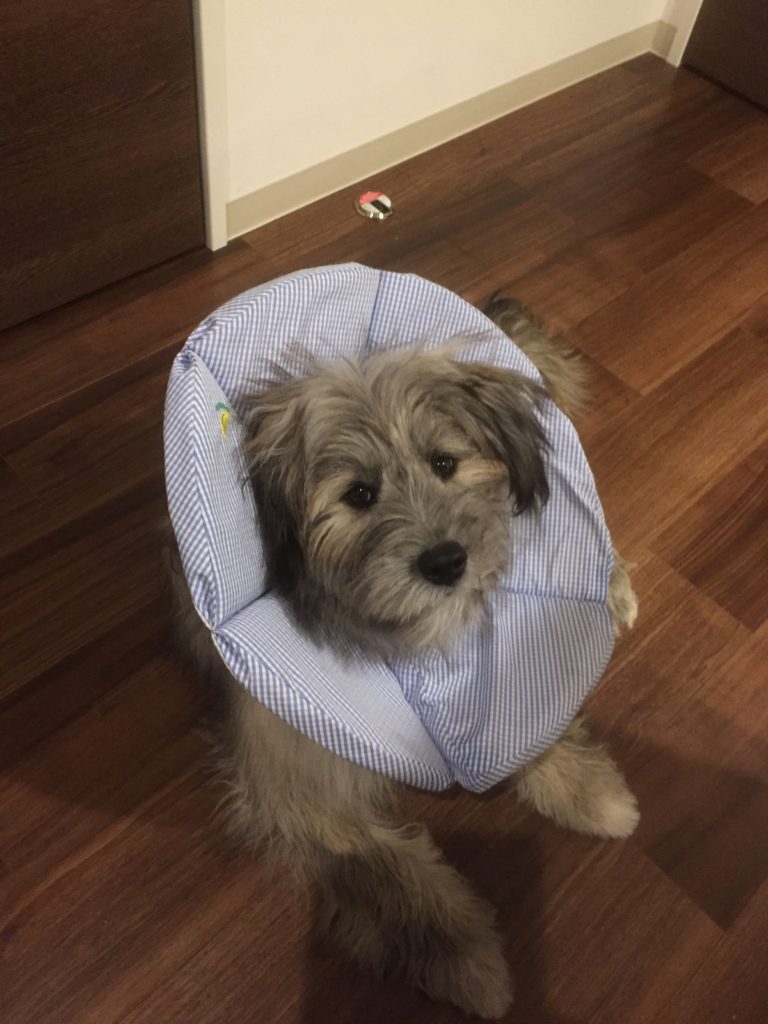 前回の骨折の時と同様に、縫合部を齧らないようにエリザベスカラーとかいう